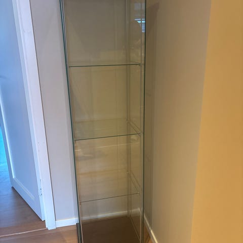Konstruksjon: Skapet har glassvegger på alle fire sider og tre glasshyller. Toppen og bunnen er laget av treplater (i dette tilfellet hvite).