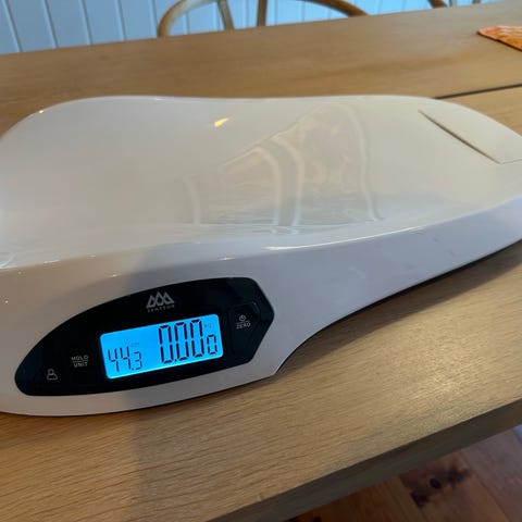 Torcom digital babyvekt i hvit plast. Vekten har integrert digitalt display med knapper for betjening. Egnet for veiing av spedbarn og små barn som ligger eller sitter på vektoverflaten. Drives av batteri