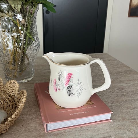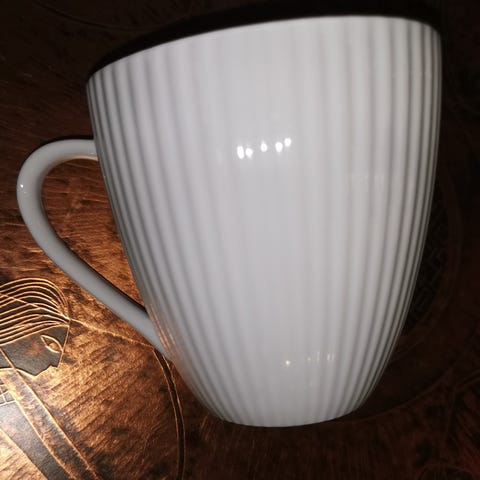 Muggen er pent dekorert med gull og sort stripe øverst, gullstripe på hanken.