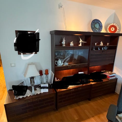 Er i 3 deler. Høyskap 192x60, midtre del med skap 120x60, siste del med skap/skuffer/hylle er 120x60. Noen merker oppi skuffene men har ikke noe å si for bruk. Gir ikke bort deler, kun hele. Førstemann til mølla. Må evt demonteres/bæres ut selv av den som henter så må komme 2 stk. Ring 99730797 for å avtale henting.