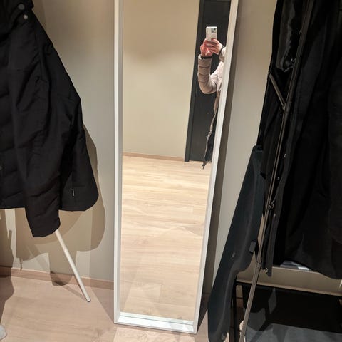 IKEA speil med svart ramme. Rektangulær form med avrundede hjørner. Speilet har en markert, bred ramme i mørk farge og glatt speilflate. Kan brukes som veggspeil i for eksempel gang, soverom eller stue. Bakside med festeanordninger for montering på vegg.