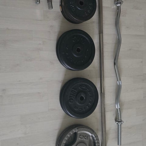 Mange vektskiver, hantel stenger, rett stenger og curlstenger selges.