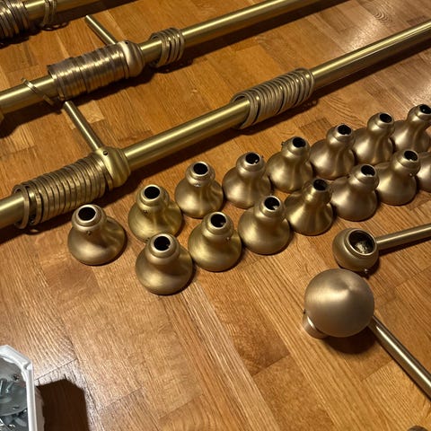 Selger en rekke valnøttfargede gardinstenger med vakre holdere, endestykker og ringer med gardingkroker. Stengene og tilbehøret har solide dimensjoner, men har en smekker og elegant utforming. Selges fortrinnsvis samlet. Veil pris: kr. 50.851. Selges for kr. 15.000 grunnet flytting. Gardingene glir lett på stengene. Gardinopphenget gir et særdeles luftig og vakkert inntrykk. Jeg kan sende. Stengene bør kunne pakkes slik at den akkurat kommer inn under postens maksimale lengde mål, men dette krever et ekstra postgebyr på kr. 186.