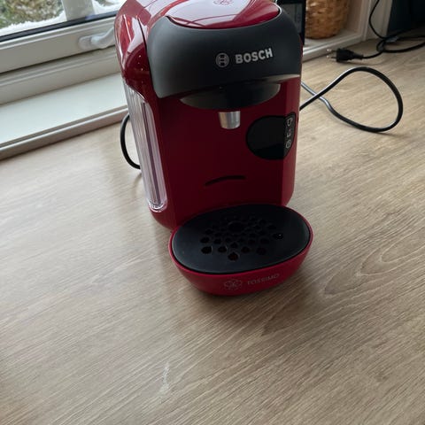 Bosch Tassimo kapselmaskin i rød og svart utførelse. Maskinen bruker Tassimo-kapsler og har avtakbart dryppbrett. Egnet for tilberedning av kaffe, te og andre varme drikker med Tassimo-systemet. Strømtilkobling via vanlig stikkontakt. Maskinen er kompakt og passer på kjøkkenbenk eller i mindre kjøkkenområder.
