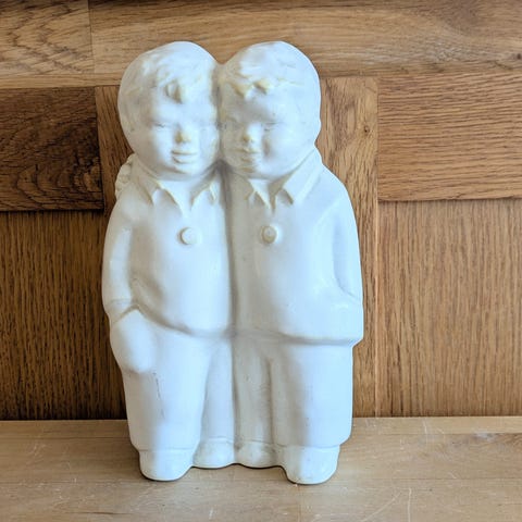 Sjarmerende og dekorativ keramikkfigur av to barn som står tett sammen. Figgjo Fayanse, Produsert Julen 1969. Designer Jørg Løve Nielsen. Høyde 18 cm