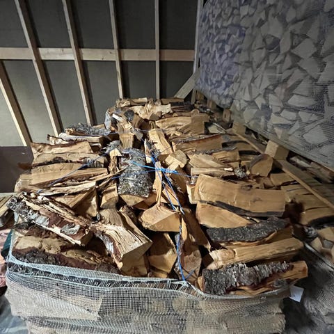 Div avkapp av ved. Tipper det er rundt 3 60l sekker om man kløyver den. Forskjellige lengder. Må tørkes. Hugget i vinter.