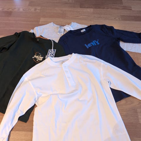 Shortser fra hm, noen i college og noen i polyester. Tskjorter i bomull fra hm, 2 fra helly hansen og 1 bjørn borg og en jotunheimen.