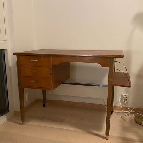 Eik skrivebord fra ca 1960 til salgs. Har hylle på venstre side og skuffer på høyre. Følger med nøkler til skuffene.