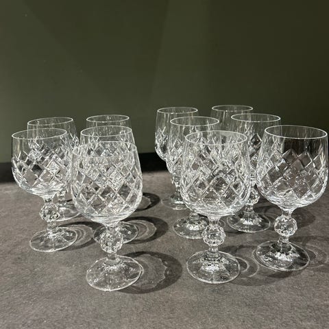 Krystallglass i tre ulike str, av de største har vi 11 stk, mellomste har vi 11 stk, de minste har vi 8 stk. Må hentes og selges helst samlet