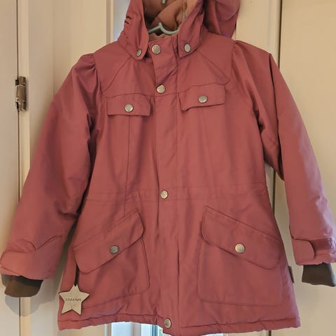 Mini A Ture parkas for jente i størrelse 122. Jakken er blå og har lengre modell med hette og avtagbar eller fast pelskant (se bilder). Den har strikk i midjen, klafflommer foran med knappelukking og ribbede mansjetter i ermene. Glidelås foran med beskyttende klaff. Ytterstoff og fôr er laget for å gi god beskyttelse og komfort i kjøligere vær. Passer til hverdagsbruk i barnehage og skole i høst- og vintersesong.