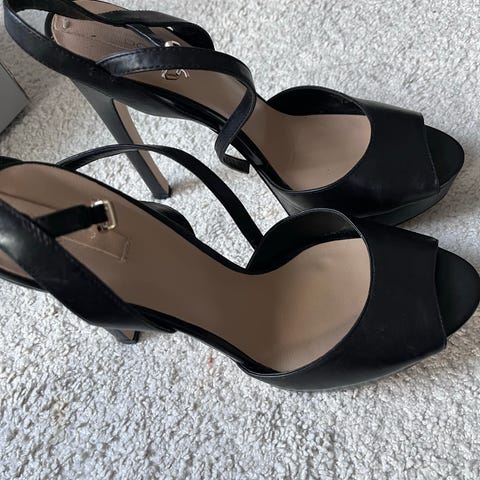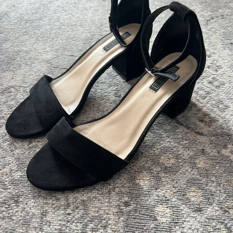 Nelly hæler i størrelse 37. Svarte åpne hæler med ankelrem og spenne. Brukt ett fåtall ganger og oppbevart tørt og innendørs.