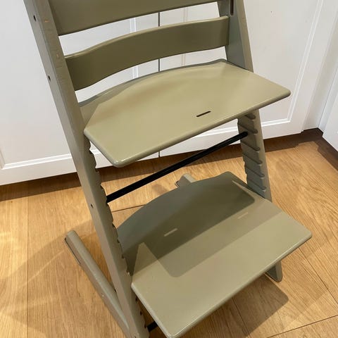 Stokke Tripp Trapp høy barnestol i blå farge. Klassisk trappeformet barnestol med justerbar sitteplate og fotbrett som kan flyttes i høyden etter barnets størrelse.