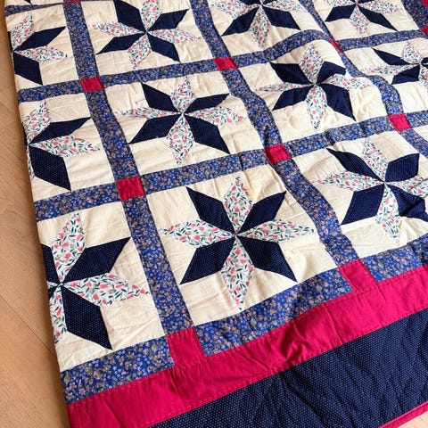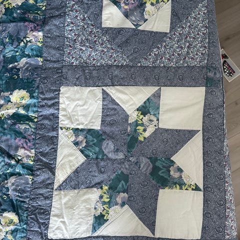 Quilted teppe. Passer til seng på 120 cm. Helt og fint. Splitt på siden så det henger pent på sengen.