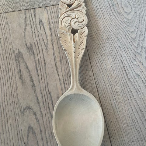 Liten treskje med ergonomisk utformet skaft. Skjeen har organisk form med buet håndtak som gir godt grep. Egner seg til servering eller som bruksskje på kjøkkenet. Laget i ubehandlet treverk med naturlig trestruktur synlig på overflaten.