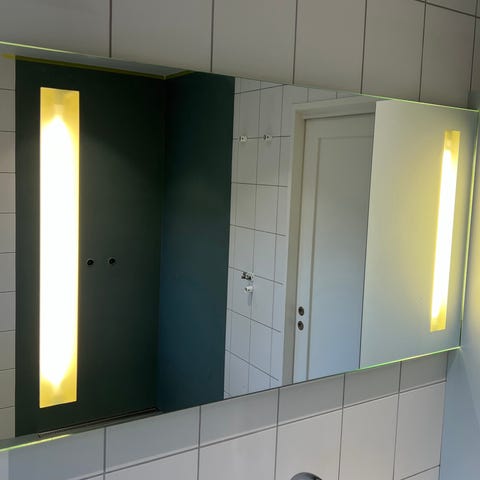 Rektangulært speil til bad, med stålkant. Mål: 75 x 120 cm. Speilet er beregnet for montering på vegg over servant eller på annet våtrom. Speilene selges samlet, eller hver for seg (500 per stk). Må hentes.