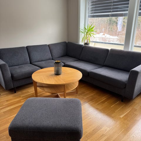 Pent brukt hjørnesofa med puff, kjøpt ny for 3 år siden for 13 499kr. Stått i røykfritt og dyrefritt hjem.