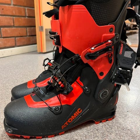 Alpina fjellstøvler i rødt med svart gummiforsterkning rundt tå og sålekant. Støvlene har høyt skaft med kraftig snøring og flere hemper for god tilpasning rundt ankelen. Grovmønstret yttersåle i gummi gir godt grep på variert underlag. Overdelen er i tekstil og syntetisk materiale. Egnet som tur- og fjellstøvler i røft terreng.