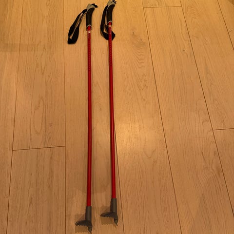 Skistaver i hvit og blå farge. Staver med håndstropper og trinser nederst.