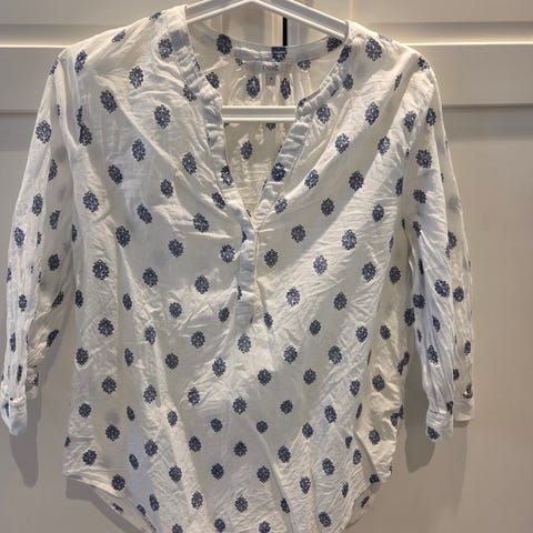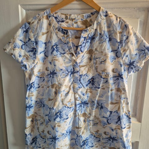 KI tekst; Bluse for dame i størrelse S. Blusen er laget i polyester og har et flerfarget bladmønster med hovedfarge i lys tone og kontrastfargede detaljer. Korte ermer med rynker og knappelukking foran. Passer til hverdagsbruk og kan kombineres med både jeans og skjørt.