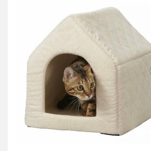 Kattehus med klorebrett på hver side. To huler katten kan ligge inne i. Møbelet har to liggehuler med polstrede åpninger og en myk pute på toppen som liggeplass.