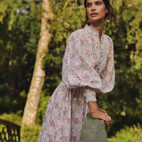Mos Mosh sommerkjole i størrelse S for dame. Kjolen er beige med blomstrete mønster og har knelengde. Den er laget i viskose, med V-utringning, trekvart ermer med volangkant og knytebelte i livet for justerbar passform. Passer til bruk på varme dager, ferie og hverdagsbruk.