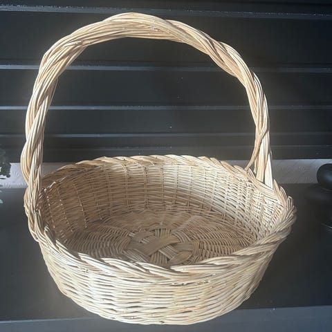 Div. flettede kurver naturfarget. Dette er håndflettede kurver i ulike størrelser og fasonger, alle med hank. Kurvene er laget i naturfarget flettet materiale, sannsynnerligvis av naturlig pil og egner seg blant annet til oppbevaring, dekor eller som bære- og piknikkurver eller til sopp plukking. Kurvene kan brukes hver for seg eller samlet, avhengig av behov for størrelse og form. Kurvene selges pr. stk. kr. 100.- Kurvene er: