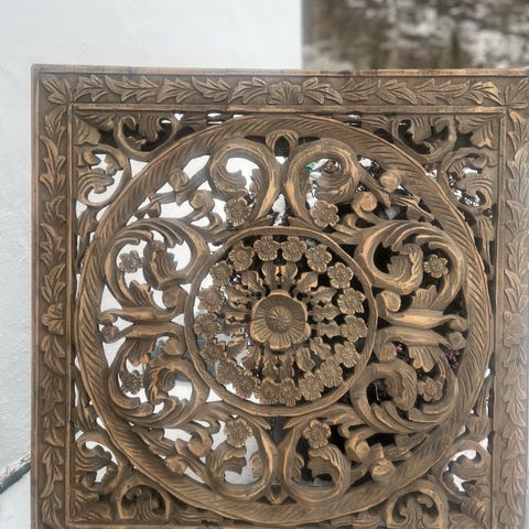 dekorative veggpaneler i utskåret treverk. Panelene har et kvadratisk format med gjennombrutt, ornamentert mønster og ramme rundt. Lyse tretoner og detaljert utskjæring gjør dem egnet som veggdekor eller som dekorative elementer i interiøret. Kan henges opp enkeltvis eller som par for et symmetrisk uttrykk.