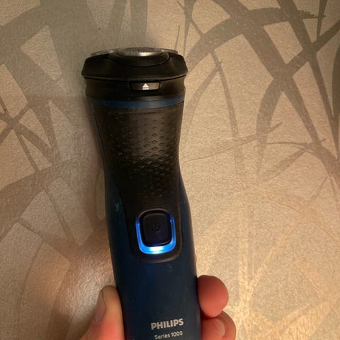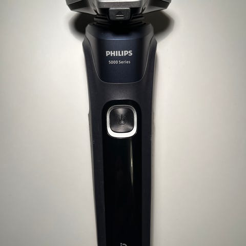 Philips Series 5000 barbermaskin i svart farge. Modellen har roterende skjærehoder med tre skjæreringer og er merket med «Wet & Dry», som gjør den egnet til både tørr- og våtbarbering. På baksiden finnes en utfellbar trimmer som kan brukes til kanting og detaljforming av skjegg og barter. Barbermaskinen leveres med et Philips-beskyttelsesetui med glidelås for oppbevaring og transport.