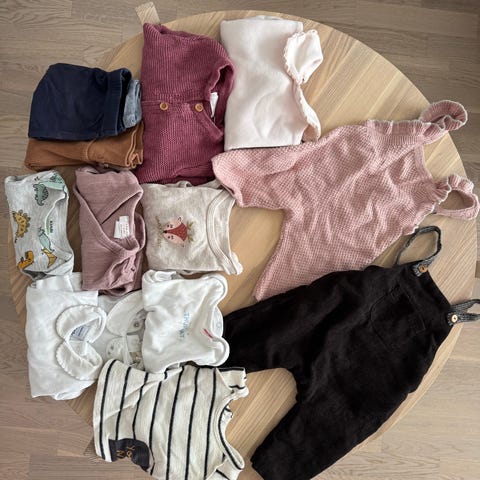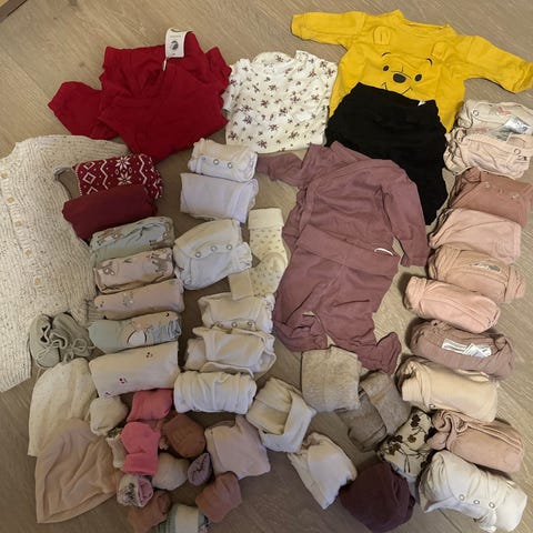 babyklær pakke flerfarget jente 62/68. Pakken inneholder ulike plagg for baby, blant annet bodyer, pysjamaser og bukser i flere farger og mønstre, samt lue og sokker. Klærne er i myke materialer egnet for baby, i nøytrale og lyse fargetoner med noen trykk og mønstre. Passer jente baby i 62/68, typisk for de aller minste. Egnet som basisgarderobe med flere plagg til både innebruk og soving.