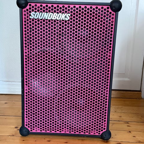 Soundboks bærbar høyttaler med frontgitter i lilla og svart kabinett. Det følger ikke med batteri, så det må kjøpes selv, hvis du vil bruke den uten at den er koblet til laderen må du ha batteri. Den er lite brukt.
