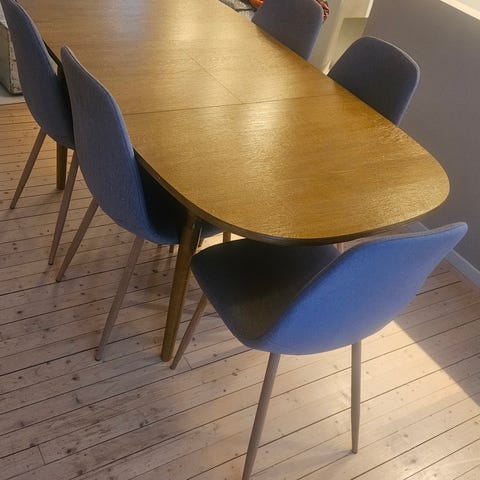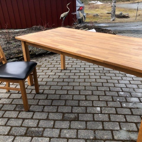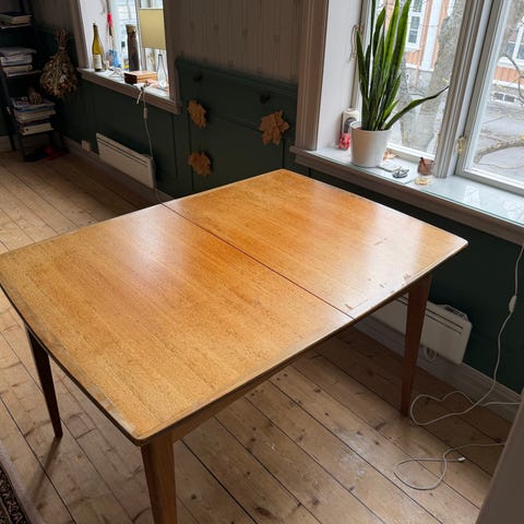 Flott og stødig norskprodusert spisegruppe i teak. Stolene (6 stk) er Pia fra Sandvik. Spisegruppa er dessverre malt. Umalt gruppe av samme type selges til kr 4000,- for bordet og 1500,- pr stol. Ved søk på nettet om mulighet til å fjerne maling kommer følgende opp: Ja, det er fullt mulig å fjerne maling fra teakmøbler ved hjelp av maling- og lakkfjerner, skraping, eller forsiktig sliping. Siden teak ofte er finért med et tynt lag, anbefales kjemisk fjerner (f.eks. Liberon Stripper) for å unngå å skade treverket. Avslutt alltid med møbelrens, pussing og ny olje/lakk.