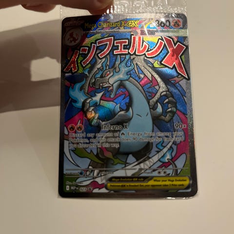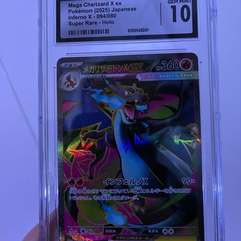 Pokémon Mega Charizard X EX samlekort i japansk utgave med holo-effekt. Kortet er innkapslet og gradert, som vist på bildene. Motiv av Mega Charizard X på forsiden, CGC PRISTINE 10! Egnet for samling og kommer i beskyttende etui.