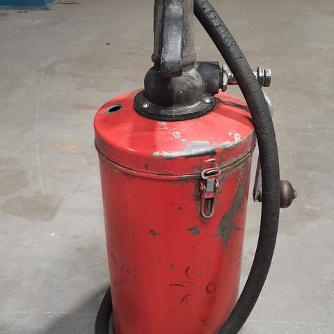 Wayne manuell oljepumpe i metall, frittstående modell med håndpumpe og slange. Beholderen er sylinderformet med fire ben for stabilitet. Pumpehuset har integrert bærehåndtak.