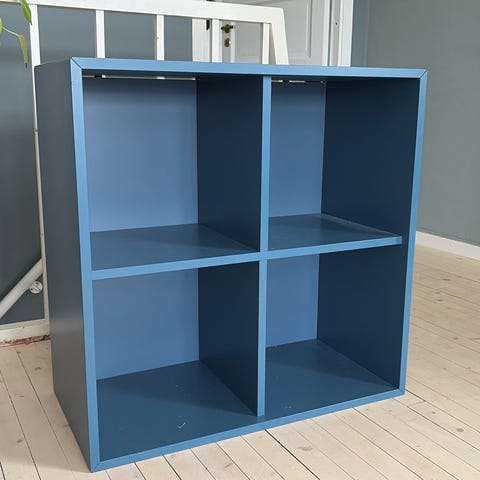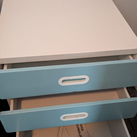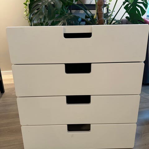 IKEA oppbevaringskommode med fire skuffer . Har malt tre av skuffene hvite, den siste er blå. Raskt og enkelt å male i ønsket farge. Kommoden har et enkelt design med utsparinger som håndtak på skuffene. Den øverste skuffen har innvendige skillevegger for organisering. Pent brukt, fungerer som den skal. Kommoden har et lite bruksmerke på høyre siden.