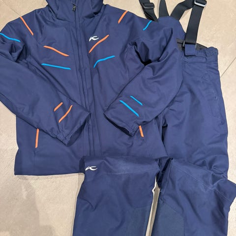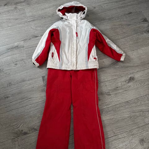 Jakken har glidelåslukking foran, høy krage og hette, samt lommer i sidene med glidelås. Buksen har rett passform. Kun brukt på ski, og har ingen slitasjer/bruksmerker. Selges samlet som sett for 1600kr.