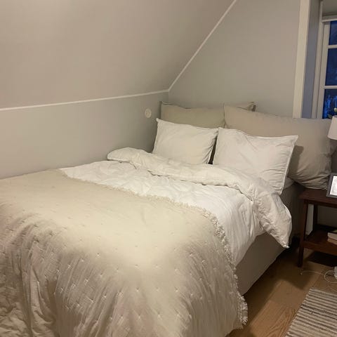 Overmadrassen er godt brukt og er litt nuppete og bruksmerker. Resten av sengen er i god stand. Kan kjøpes uten overmadrassen også.