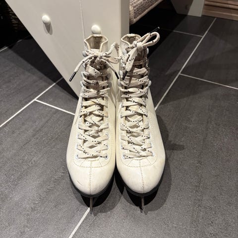 Joda kunstløpskøyter for barn i størrelse 33. Klassisk hvit modell med snøring og høy ankelstøtte. Overdel i syntetisk materiale og sort hæl/bladfeste. Passer til bruk på isbaner og skøytebaner for barn som vil øve grunnleggende skøyteteknikk eller fritidsbruk på is. Må hentes