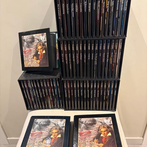Samling med klassisk musikk på CD fra ulike komponister, dirigenter og orkestre. Bildene viser blant annet utgivelser fra selskaper som Deutsche Grammophon, Decca, Erato og andre. Inneholder både enkelt-CD-er og boksett med opera og orkesterverk. Passer for deg som ønsker et utvalg innspillinger av klassisk musikk samlet på fysiske CD-plater. (73 enkle CD'er i "Compact Disc Case")