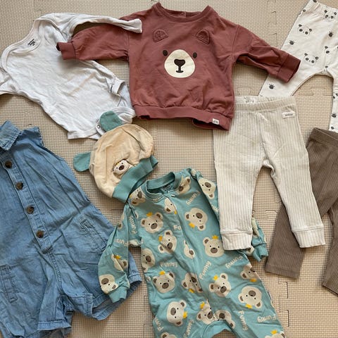 Klespakke til våren. Snekkerbukse fra Polarn&Pyret, 4 kortermete bodyer, 2 leggings og en onesie med bjørnemotiv. Alt er helt nytt og vasket, kanskje brukt en gang. Størrelse 6-9mnd