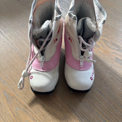Rossignol langrennsko for barn i rosa og grå farge. Skoene har snøring med stramming foran og glidelås over vristen. Overdelen er i syntetisk materiale med trykk av hjerter og snøkrystaller. Innsiden ser ut til å være fôret for ekstra varme. Sålen er tilpasset langrennsbindinger (se bilder for type og detaljert utforming). Egner seg til bruk for barn på ski- og langrennsturer. Str 26