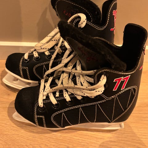Aspen 68 ishockeyskøyter for barn i størrelse 34. Skøytene har svart overdel med hvite og røde detaljer og snøring foran. Polstret ankelparti og tunge gir støtte rundt fot og ankel. Blad i metall egnet for bruk på isbaner til ishockey eller generell skøytebruk for barn. Må hentes