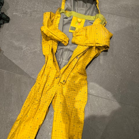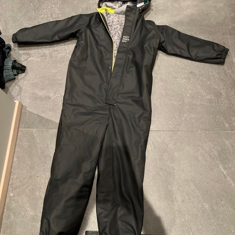 Kattnakken regndress for barn i størrelse 134. Regndressen er unisex og kommer i svart med mønster. Yttermateriale i polyester med vanntett belegg. Dressen har hette, elastikk ved ermer og ben, samt trykknapper og glidelås foran. Egnet som yttertøy i vått vær for barn i aktuell høyde/størrelse. Bilder viser slitasje og hull i stoffet enkelte steder som bør tas i betraktning ved bruk eller eventuell reparasjon - fantastisk dress som trenger reperasjon før den har mye bruk igjen
