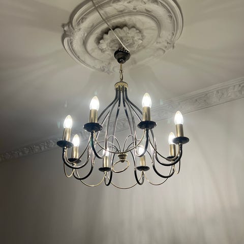 Lysekrone som både passer bra til rosett og uten. Glassperler og sølvdetaljer. Har to stk, selges for 150kr hver.