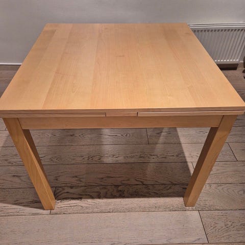Svært pent brukt dansk spisebord i eik. Det er to innebygde ekstra plater som gjør at lengden på bordet kan være 140 cm, 190 cm eller 240 cm. Bordet har svært praktisk såkalt 'hollandsk uttrekk - ekstraplatene ligger under bordplaten og dras enkelt ut med et en hånd. Bordplatene har finerte over- og undersider, med kanting av heltre. Bordbein og understell er i heltre. Bordet er flatpakket og derfor enkelt å transportere.