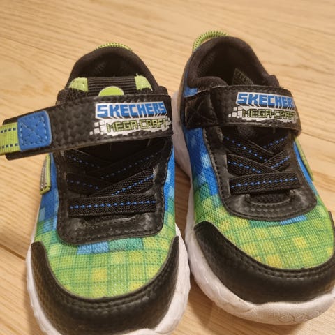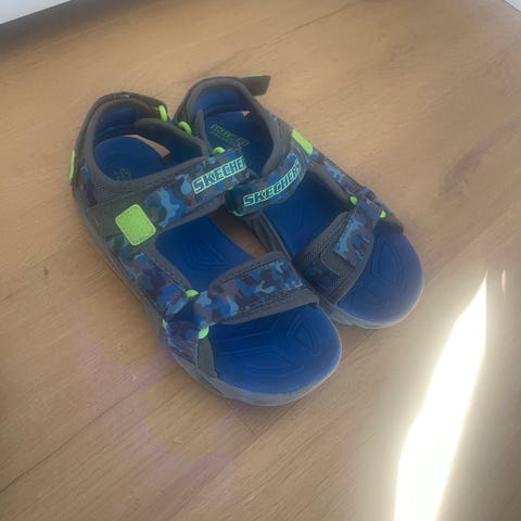 Skechers Lights sandaler for gutt i størrelse 25. Åpne sandaler med justerbare borrelåsstropper over fot og rundt ankel. Overdel i blått med grønne detaljer og mønster. Innvendig såle i grønn farge og yttersåle i lys farge med innebygde lys som blinker ved bevegelse. Egnet som sommersko eller innesko for barn. Lysene fungerer som de skal, se bilde :)