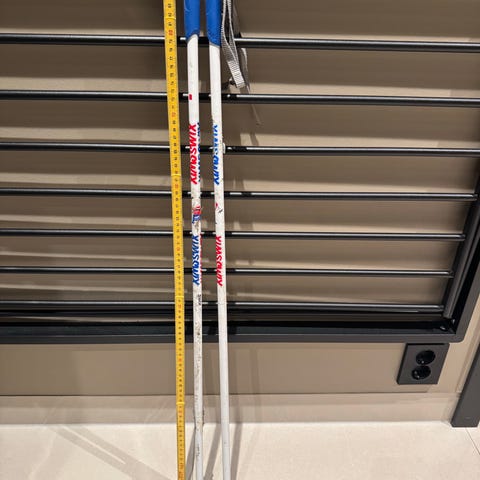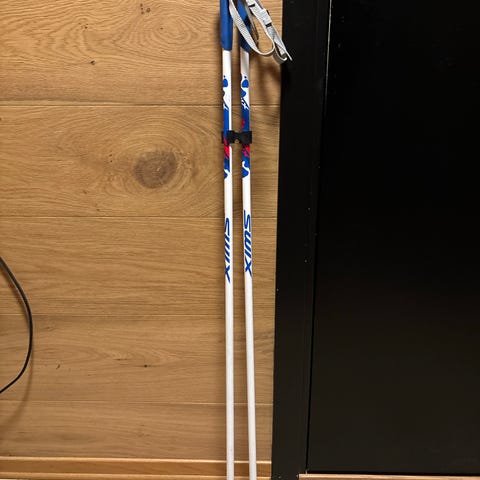 Trolla skistaver for barn. Lengden er ca. 90 cm, målt fra spiss til topp av håndtak. Stavene har røde håndtak med håndreim og blå trinser. Egnet som alpinstaver eller generelle skistaver til barn, avhengig av behov og type skiutstyr.