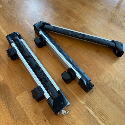 Jeg selger også et matchende Thule SnowPack 7324 skistativ (50 cm bredde, plass til 4 par ski eller 2 snowboard). Dette passer perfekt i T-sporet på disse stengene.