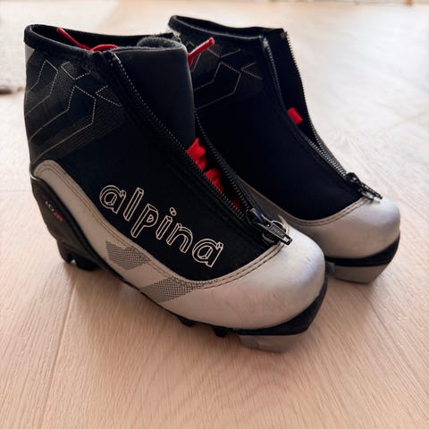 Alpina langrennsstøvler i svart, grå og rød farge. Støvlene har glidelås og beskyttende overtrekk foran, samt hæl- og ankelstøtte. Sålen er tilpasset moderne langrennsbindinger. Egner seg til klassisk langrenn og turbruk. Normal bruksslitasje, og litt slitasje i kanten av foret på én støvel (se bilde), men fullt brukbare og glidelåsene fungerer som de skal. Selges fordi de er blitt for små.