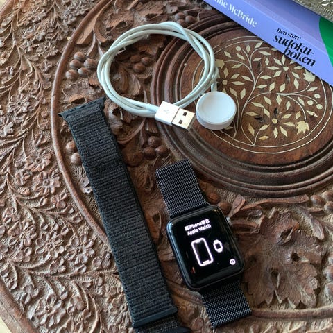 Selger en Apple Watch Series 3 i svart med svart justerbar meshreim (magnetlås).