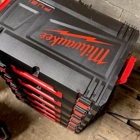 Milwaukee Packout verktøykasser og sortimentsbokser. Knallbra og dyrt utstyr Systemet består av stablebare bokser med gjennomsiktige lokk og uttakbare inndelere for skruer, muttere og annet småmateriell.